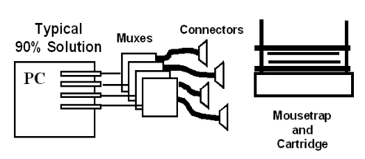 There are times when both PC Board probing for functional test and debugging is needed, yet the higher-level functions of Software Configuration and Calibration and Adjustment are needed. Perhaps, after new software is downloaded, an on-board A/D needs calibration, or an on-board amplifier needs adjustment. For this sort of need, The Mousetrap Functional Test System is a good solution. |