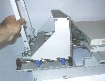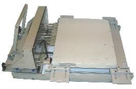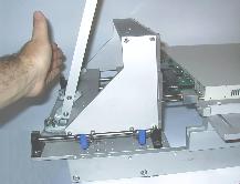 The 3-picture sequence below shows the same Drawer with a new connector plate. This connector plate is for a 24-port (3-2x4 ports) ethernet switch. The ethernet cables are not shown, for clarity; they plug in to the low-insertion fingerboards. This allows a custom connection map to be implemented at the connector plate, and still retain the speed and ease of The Drawer's mass-connect / disconnect design. |