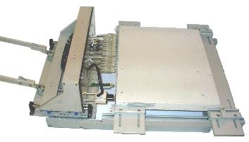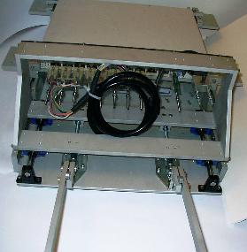 These are examples of a system that we put together to test functionality and connector density. This particular system uses an acrylic plate to mount the various connectors, instead of G-10, since acrylic is transparent, and this makes descriptions easier. Fig. 1 shows the Drawer closed from the back. The connections, left to right, are 8 fiber optic connectors (our loopback has only 8 connections, but the device has 10), an ethernet port and a 120VAC connector. Fig. 2 is a side view. The Drawer is loaded from the side. This view shows the stops and other adjustable parts of the drawer. |